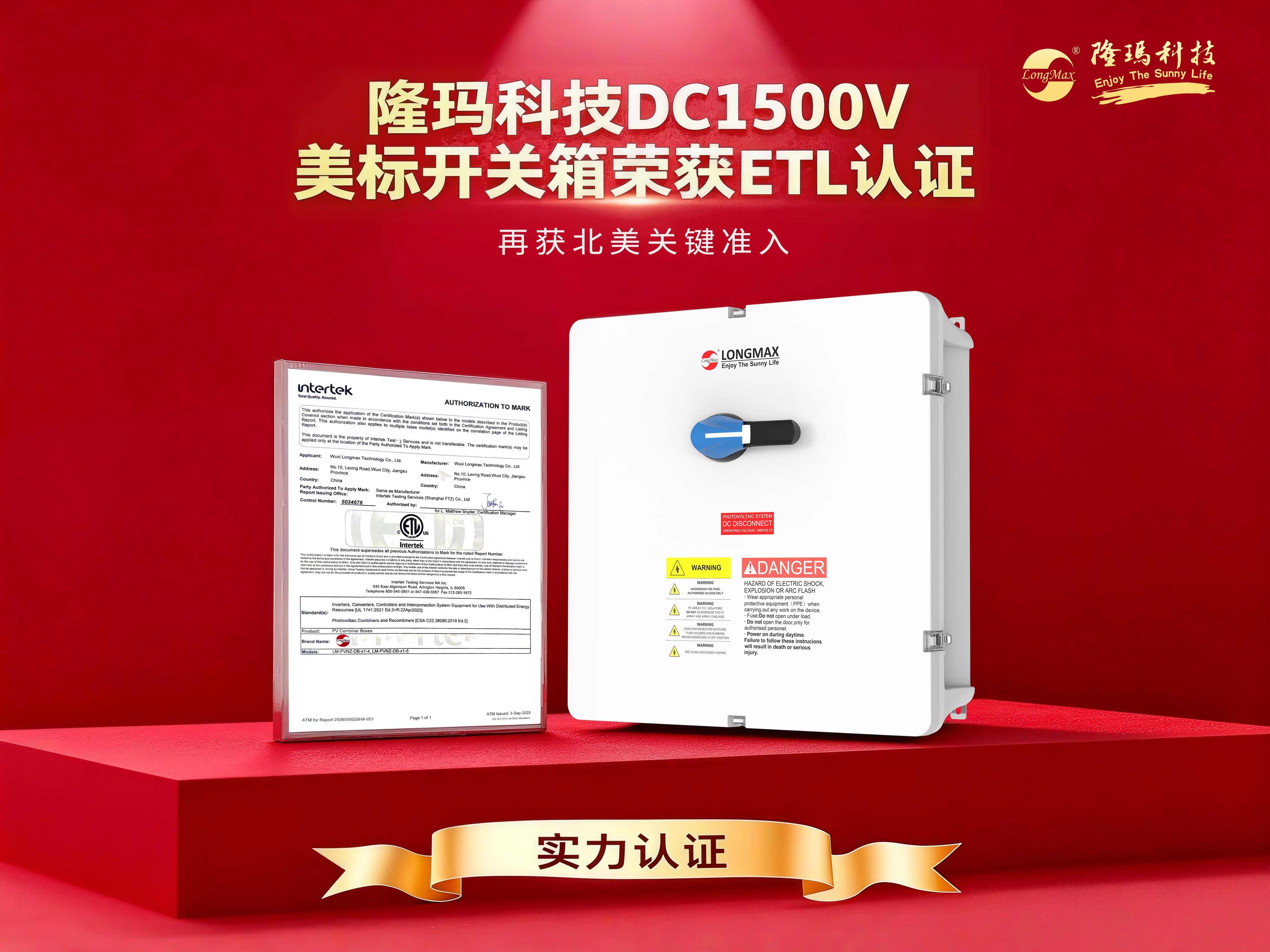 当地时间9月9日,隆玛科技在美国拉斯维加斯RE+2025国际太阳能及储能展上迎来重要里程碑——公司自主研发的DC1500V美标开关箱成功获得Intertek天祥集团颁发的ETL认证证书。该认证不仅意味着产品正式获得北美市场准入资格,更标志着隆玛科技在国际化布局和技术实力方面再上新台阶,为深化美国及全球市场拓展奠定坚实基础。